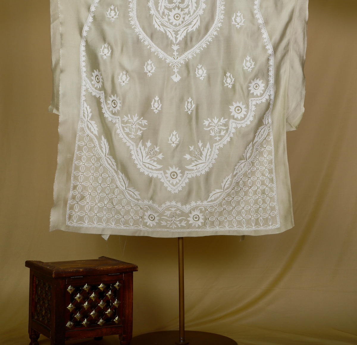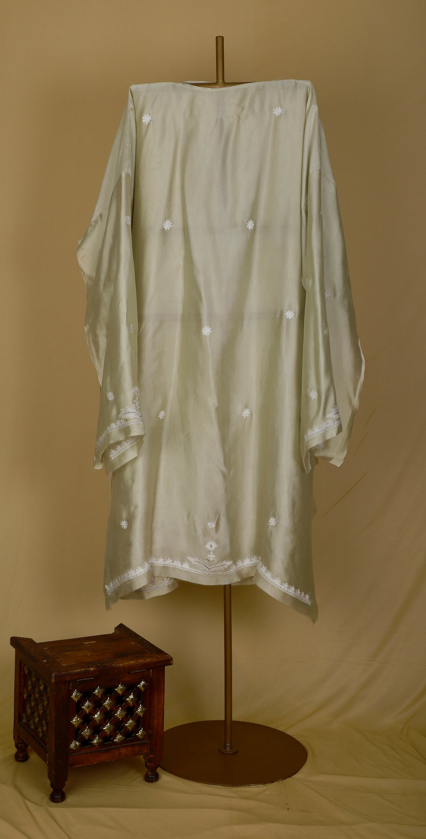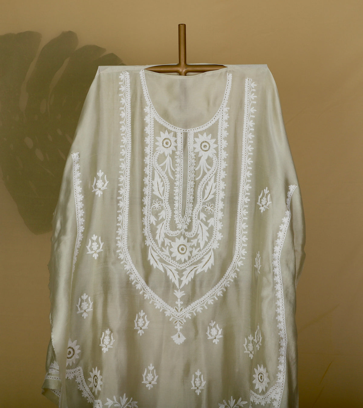 Fine white ari embroidery on the neckline, front panel, sleeves, and kurta hem